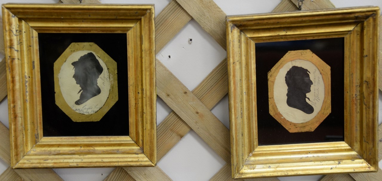 Pair of early 19th century silhouettes of Hyman Marks Philadelphia Merchant, written on revers Hyman Marks, Philadelphia Merchant, profile done 1808 Phila. Peale Museum, wife Grace Scixas Judah Marks.