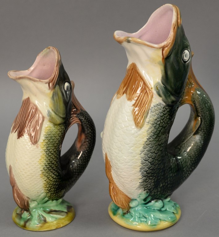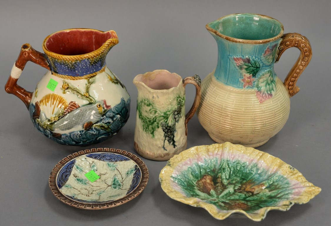 Five pieces of Majolica to include a pitcher with basket weave bottom, leaf dish, small dish, creamer, and a fish pitcher marked Shorter & sons. ht. 5 1/2 in. to ht. 8 in.