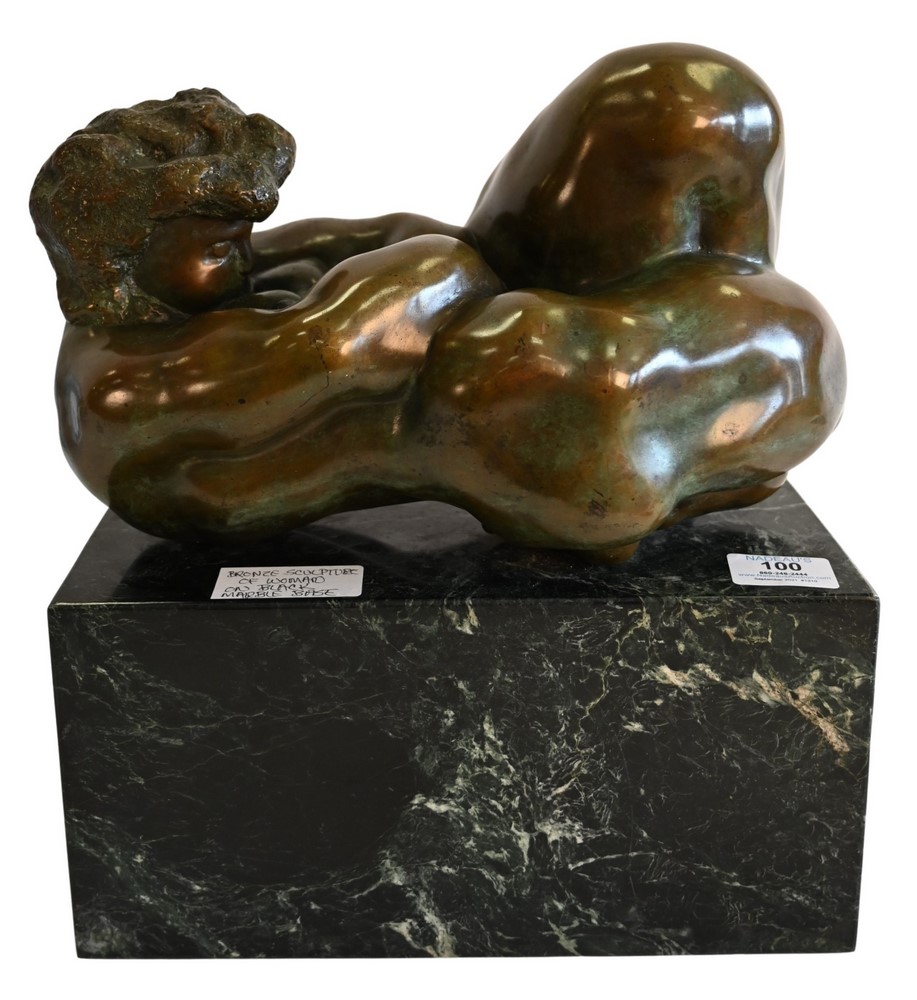 Contemporary Bronze of Nude Woman, unsigned, mounted green marble base, overall height 13 1/2 inches.