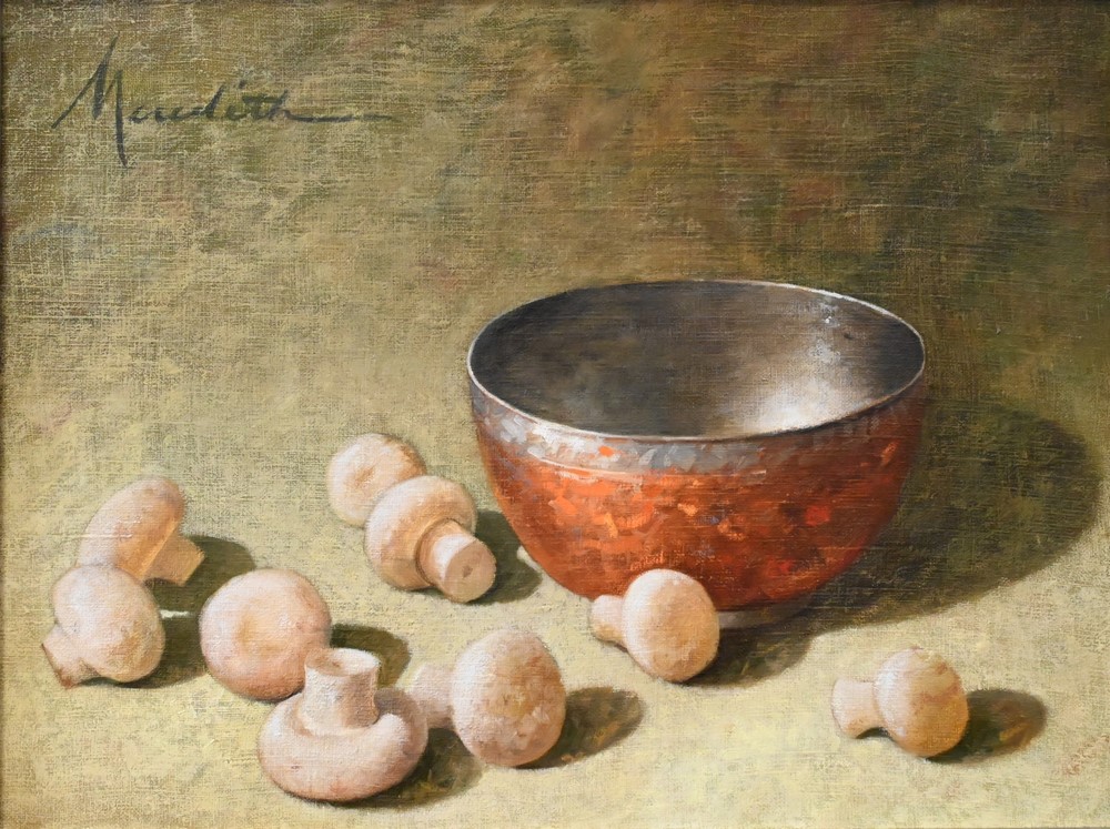 Robert Meredith (American, b. 1940), still life with mushrooms, oil on canvas, signed upper left “Meredith”, 12″ x 16″.
