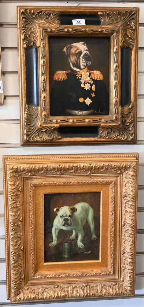 Two Piece Lot to include, after James Clonney (American, 1812 – 1867), Portrait of a Bulldog in Military Regalia, oil on panel, sign…