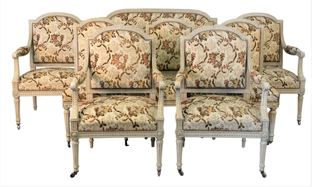 Eight Piece Louis XVI Style Salon Suite, having four armchairs, three side chairs, along with one loveseat, loveseat length 50 inches.
