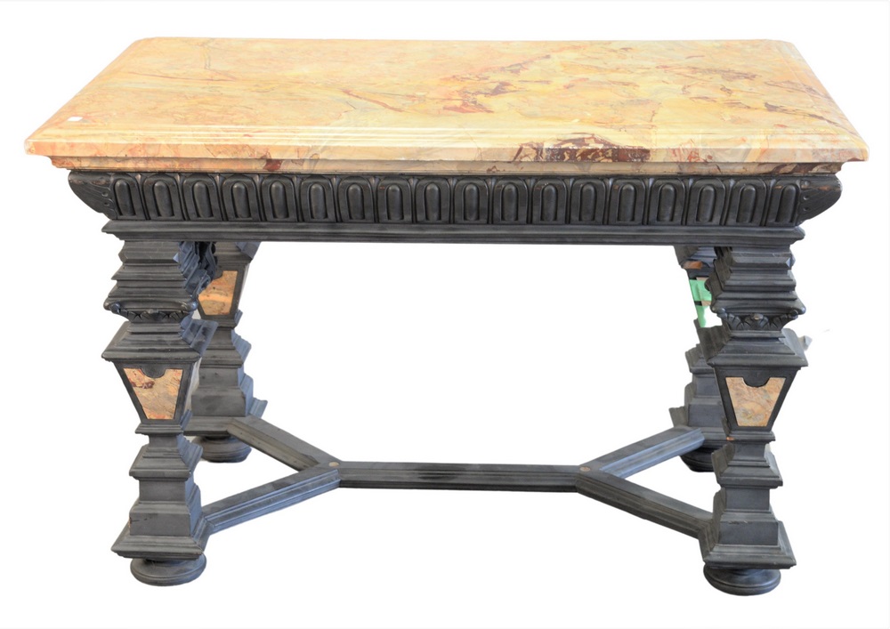 Baroque Style Table, having molded marble top on heavy base with inlaid marble panels, height 31 inches, top 32″ x 49″.