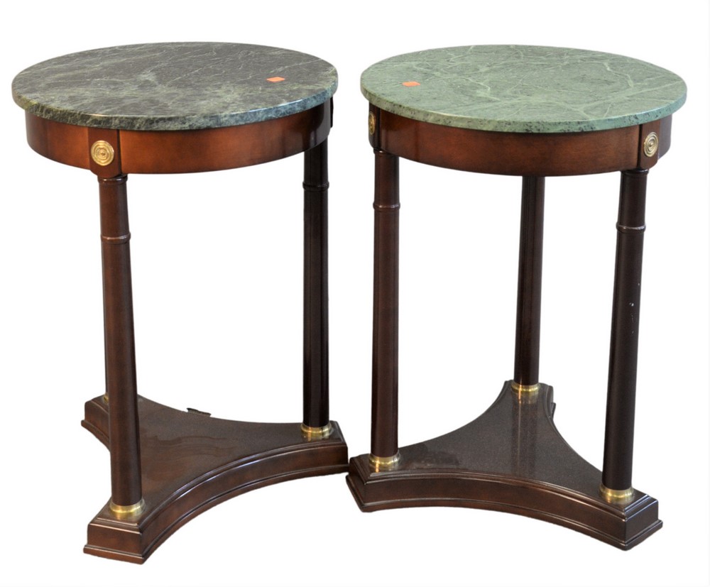 Pair of Empire Style Round Tables, having marble tops, height 25 inches, diameter 18 inches.