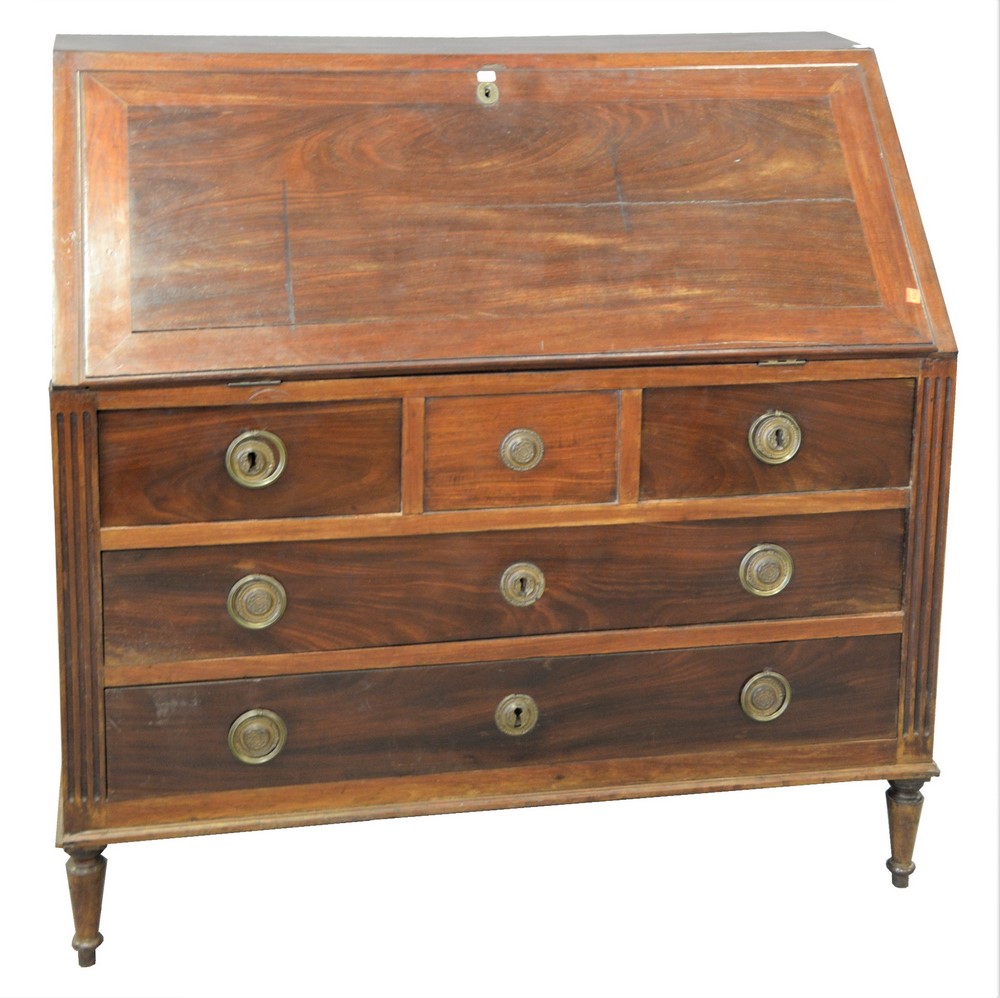 Louis XVI Mahogany Desk, having slant lid opening to drawers and well and having two over two drawers on turned legs, 18th century, …