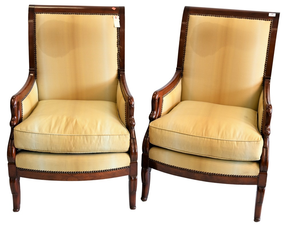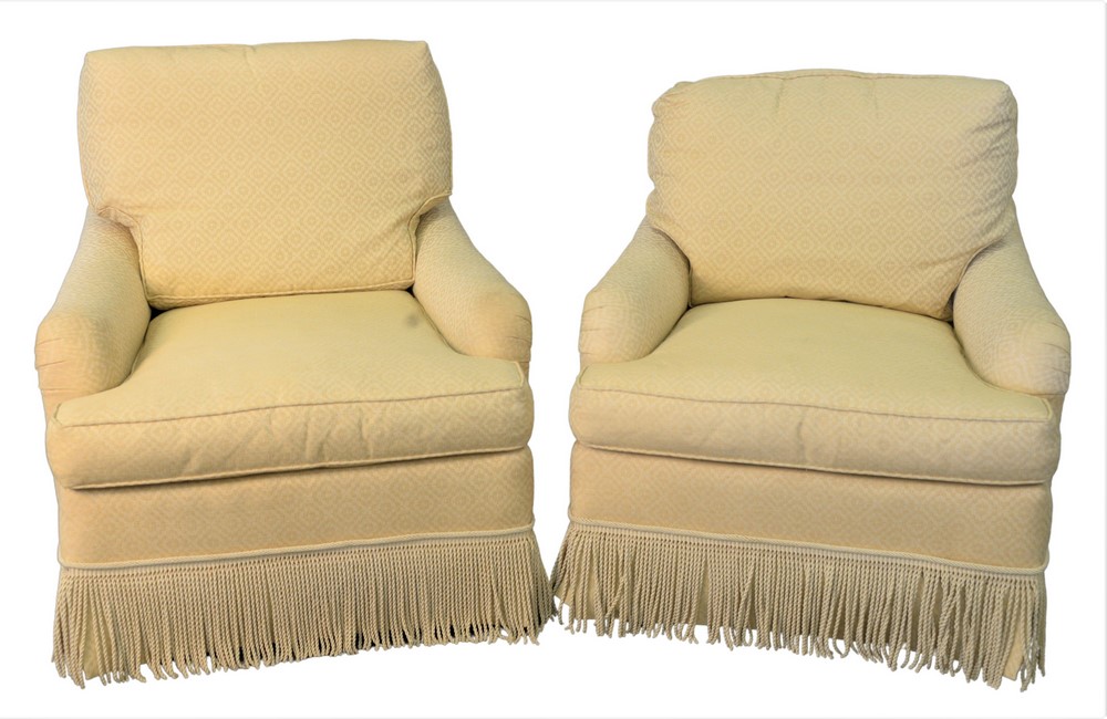 Pair of Baker Upholstered Easy Chairs, height 34 inches, width 32 inches.