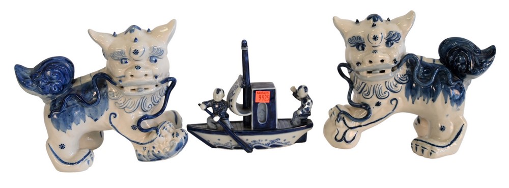 Three Piece Chinese Lot, to include pair of blue and white foo dogs along with a blue and white porcelain boat with figures, foo dog…