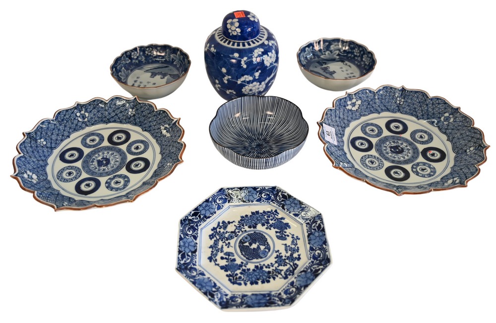 Seven Piece Chinese Lot, to include a ginger jar with lid, height 6 1/4 inches; a scalloped small bowl; an octogonal plate, diameter…