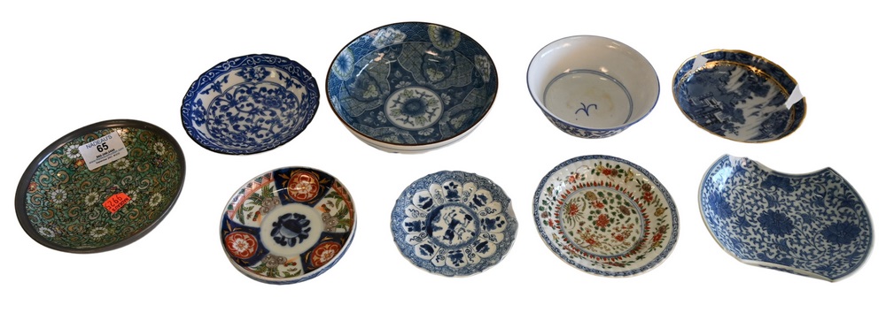 Ten Piece Lot of Asian Items, to include seven blue and white shallow dishes/bowls, an Imari saucer, a famille verte saucer, along w…