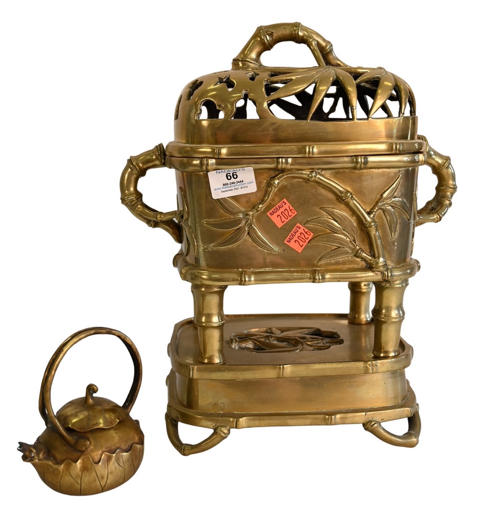 Two Piece Chinese Brass Lot, to include a reticulated censor on stand, marked on underside, along with a small brass tea kettle, cen…