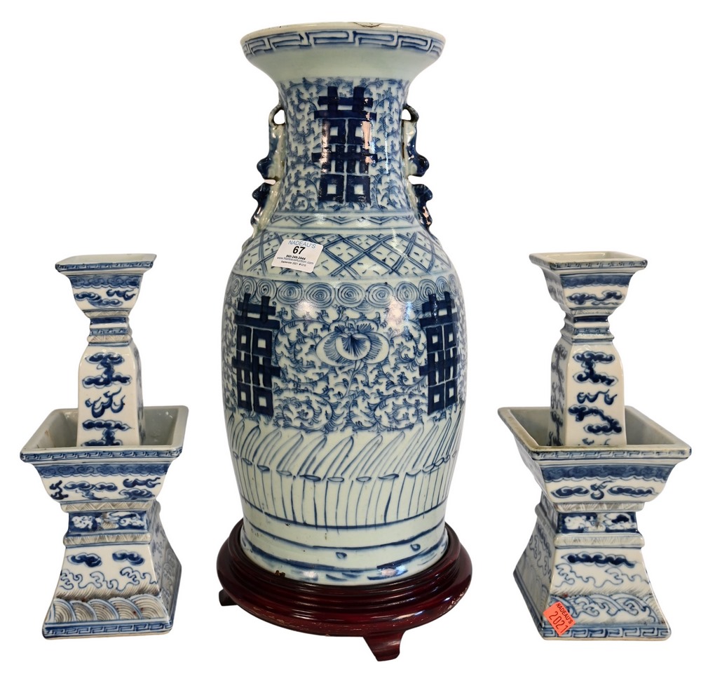 Three Piece Chinese Group, to include a blue and white vase having mounted animal form handles and painted vines; along with a pair …