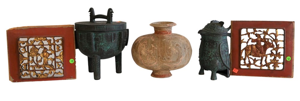 Five Piece Lot, to include a carved lidded vessel, along with a matching pitcher, a terracotta vessel, along with a pair of carved a…
