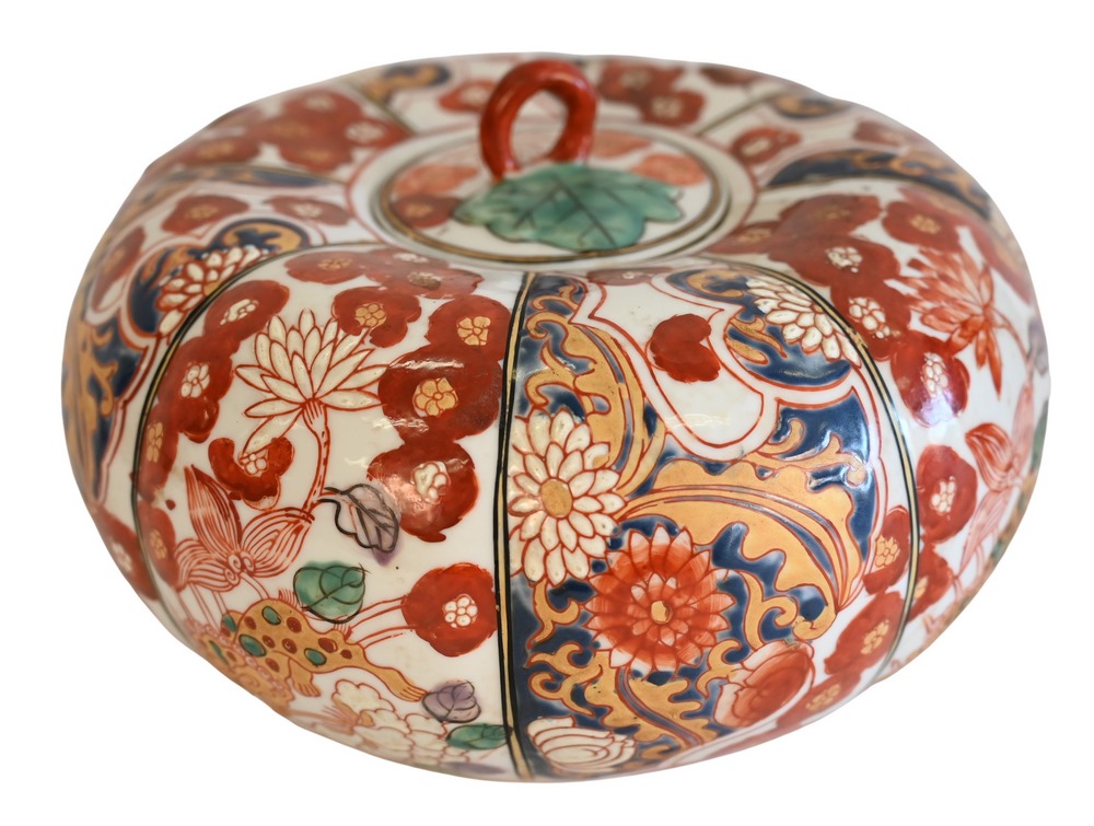 Japanese Imari Porcelain Gourd Shaped Vessel, with lid, marked on underside, height 6 inches, width 9 inches.