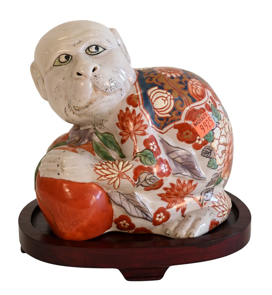 Chinese Ceramic Painted Monkey Figure, set on wood stand, figure height 7 1/4 inches.