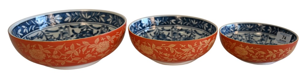 Three Japanese Porcelain Stacking Bowls, having blue and white interior with orange and gold exterior, each on wood stands, largest …
