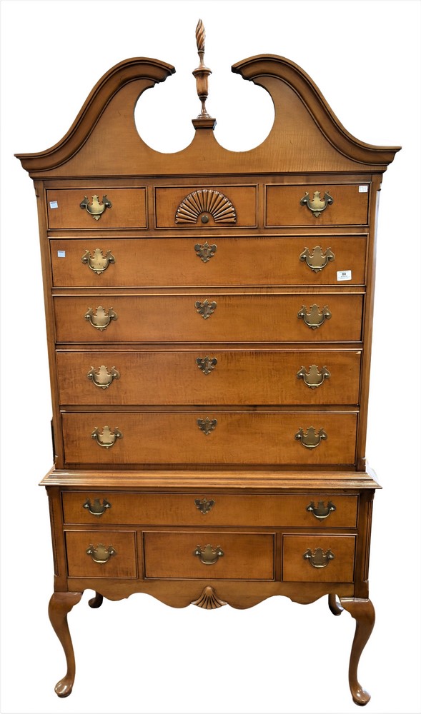 Chippendale Style Tiger Maple Highboy, height 75 inches, width 40 1/2 inches.