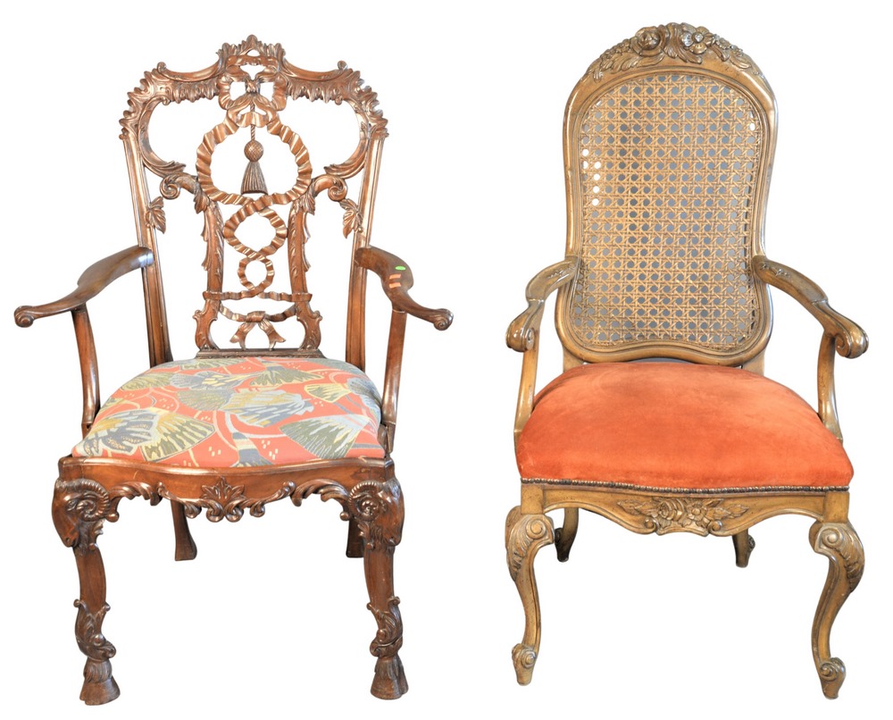 Three Piece Lot of Chairs, to include an armchair having cane back and cabriole legs, along with two side chairs having custom uphol…