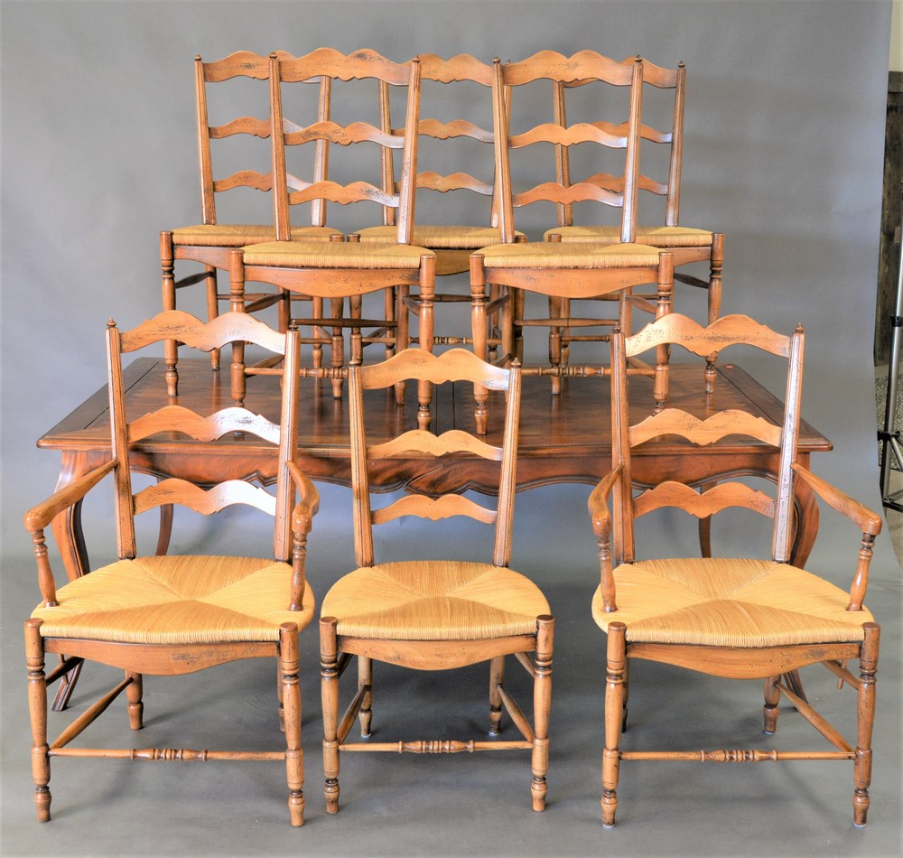 Nine Piece Louis XV Style Dining Set, to include inlaid top table along with eight rush seat chairs, two arm and six side, table has…