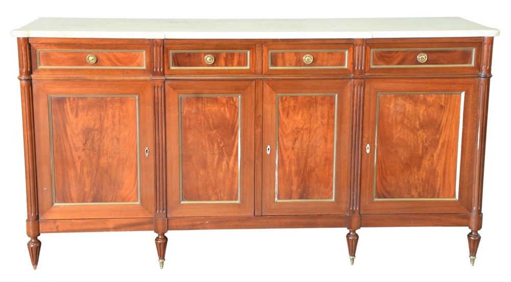 Louis XVI Style Mahogany Sideboard, having shaped white marble top and brass trim, height 42 inches, width 78 1/4 inches, depth 20 1…