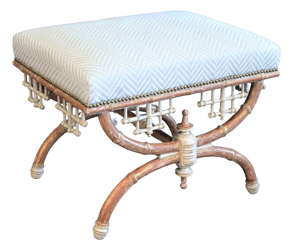 Faux Bamboo Stool, having gilt remnants and upholstered top, height 20 inches, top 20″ x 26″.