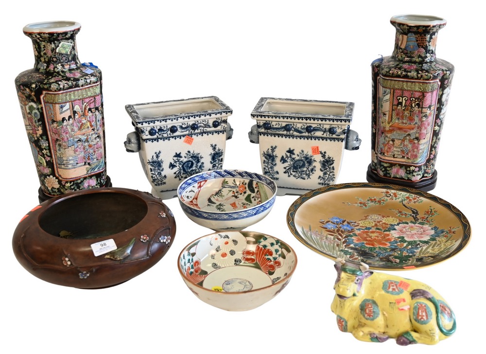 Nine Piece Asian Lot, to include a pair of blue and white planters having mounted head handles; a pair of vases having painted inter…