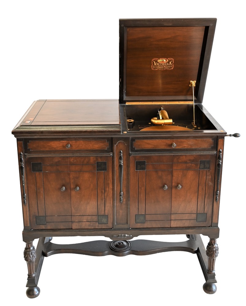 Victrola Phonograph Walnut Cabinet, having several albums of records, in working condition, height 34 1/2 inches, width 37 inches.