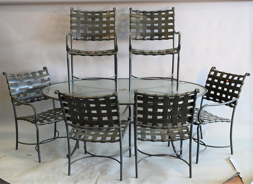 Nine Piece Brown and Jordan Outdoor Patio Set, to include an oval glass top table, six armchairs, chaise lounge, along with glass to…