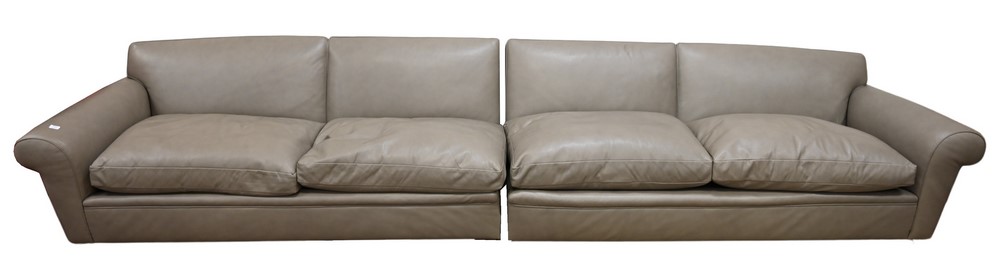 Custom Two Section Leather Sofa, missing multiple feet, height 25 inches, length 156 inches.