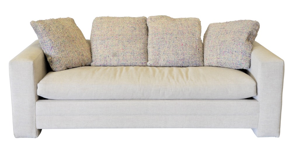 Avery Boardman Custom Queen Size Sleeper Sofa, in beige upholstery along with four throw pillows, length 87 inches, depth 35 inches.