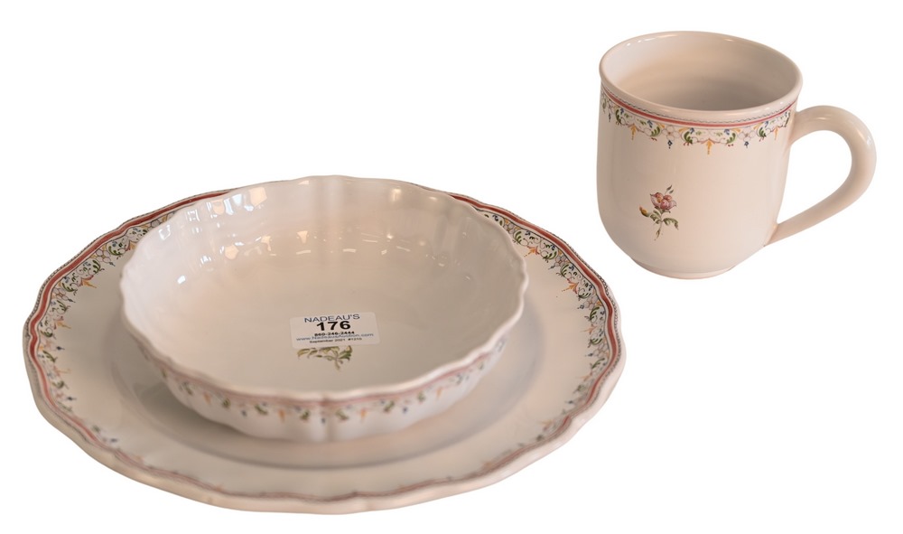 38 Piece Lot of French Faience Atelier de Segries White and Floral Dinnerware, to include 12 dinner plates, 12 soup bowls, 12 mugs, …