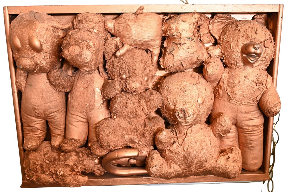 May Wilson (American, 1905 – 1986), “This Little Pig”, 1971, cloth, wood and bronze paint collage, signed, titled and dated on the r…