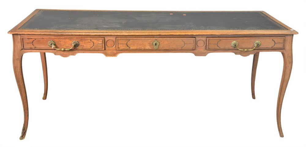 Louis XV Style Oak Writing Table, having inset tooled leather top, probably 19th century, height 30 inches, top 30″ x 72″.