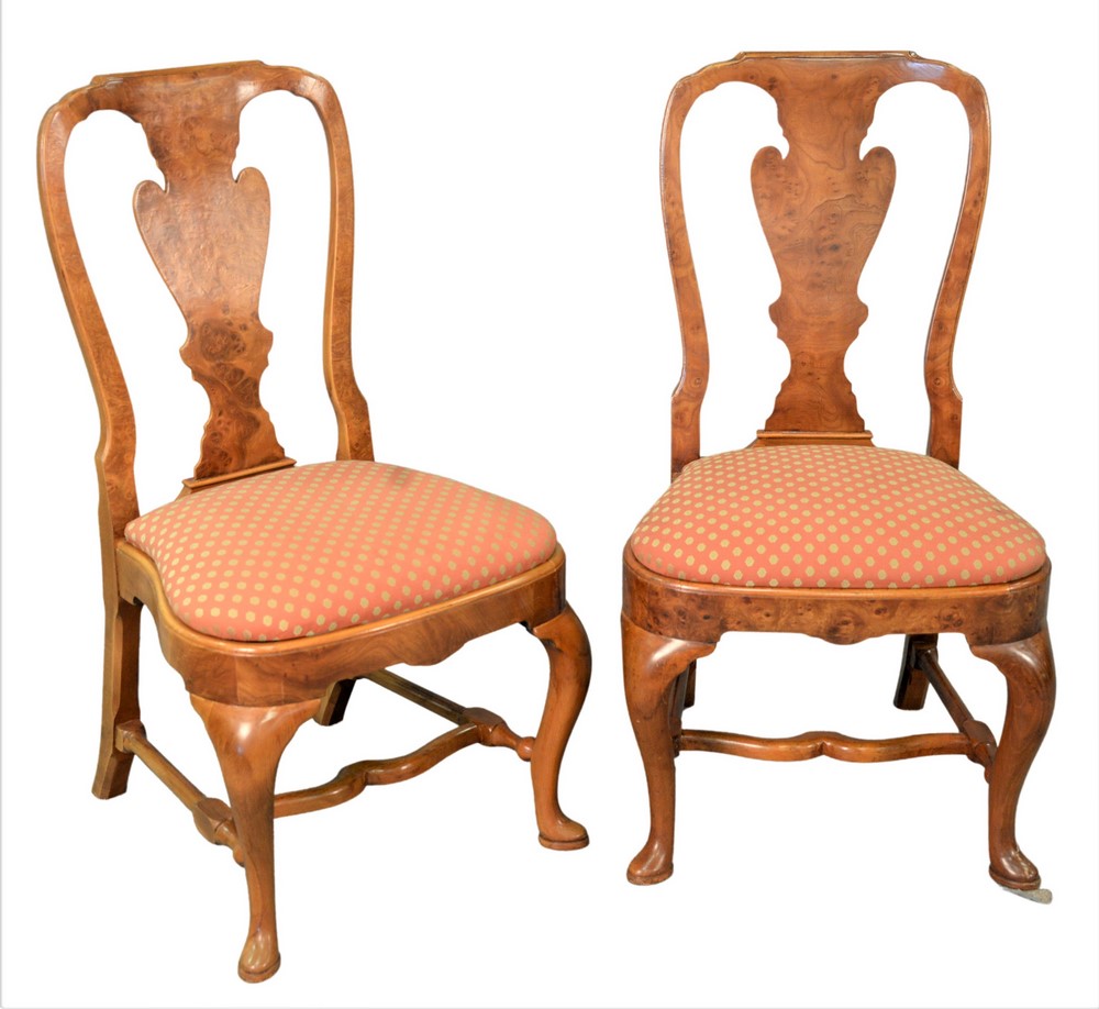 Set of Six Custom Burlwood Queen Anne Style Dining Chairs, having upholstered slip seats, height 39 inches.