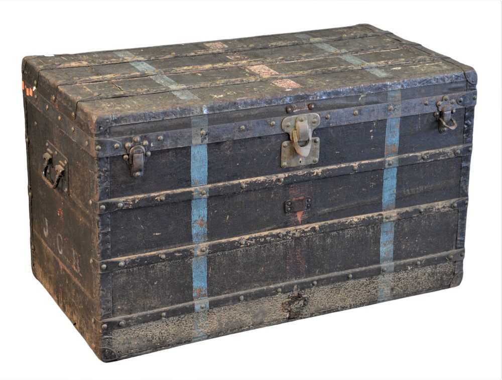 Louis Vuitton Painted Trunk, inside with staining and Louis Vuitton label, brass tacks and hardware stamped, height 25 inches, top 2…
