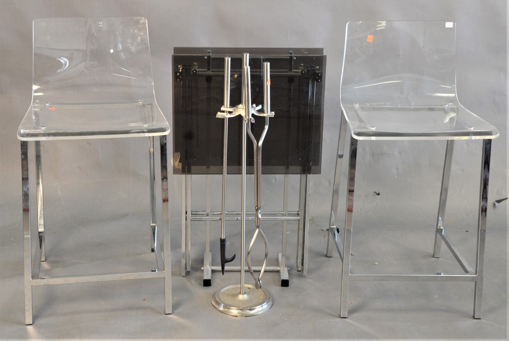 Five Piece Group of Mid Century Furniture, to include a pair of lucite barstools, two lucite folding tables, silvered fireplace tool…