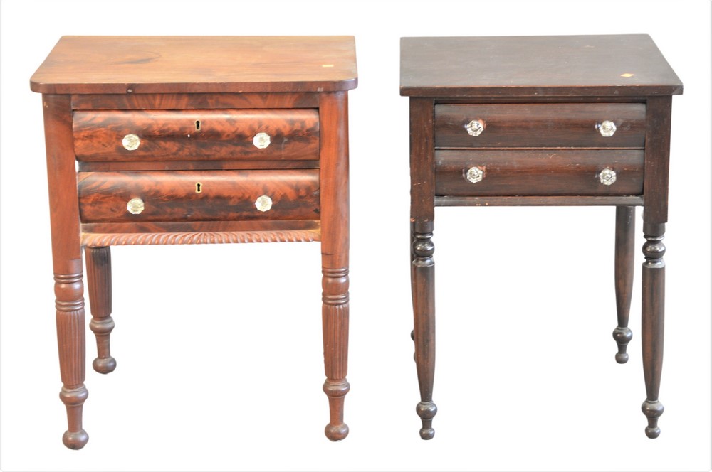 Two Mahogany Empire Stands, each having two drawers with glass pulls, raised over turned legs, height 29 and 29 1/2 inches, tops 18 …