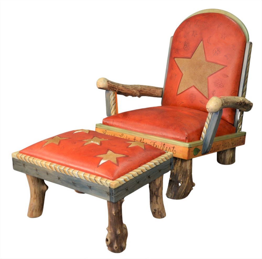 Sticks Object Art Furniture Armchair and Matching Ottoman, having red leather and cowhide upholstery, inscribed on the front “Live L…