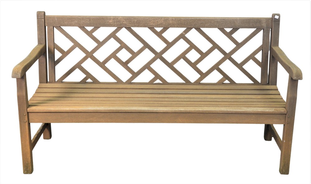 Teak Bench, having geometric openwork back, height 33 inches, length 60 inches. Provenance: Waterfront Estate, Stamford, CT.