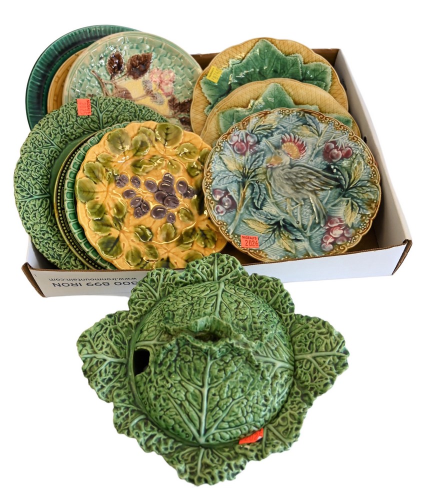 Group of Majolica Plates, to include a set of four, one with a bird, cabbage covered serving dish, etc., largest diameter 10 inches.