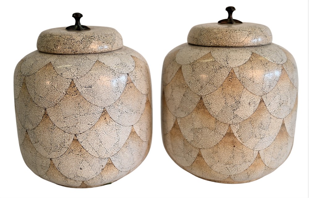 Pair of Maitland Smith White and Tan Cloisonne Lidded Ginger Jars, height 10 inches.