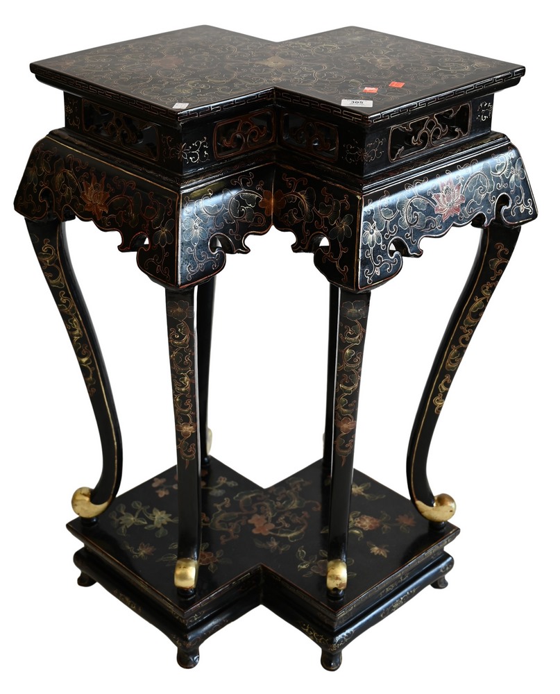 Chinese Lacquered Stand, having shaped top, height 36 inches, width 26 inches.