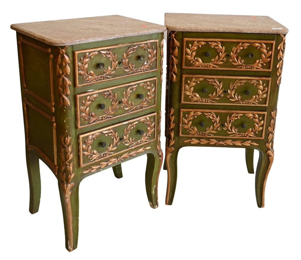 Pair of Louis XV Style Nightstands, in green paint having foliate carvings throughout and marble tops over cabriole legs, height 31 …