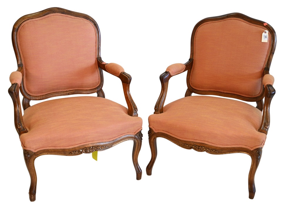 Pair of Walnut Louis XV Style Fauteuils, height 36 1/2 inches, width 26 inches.