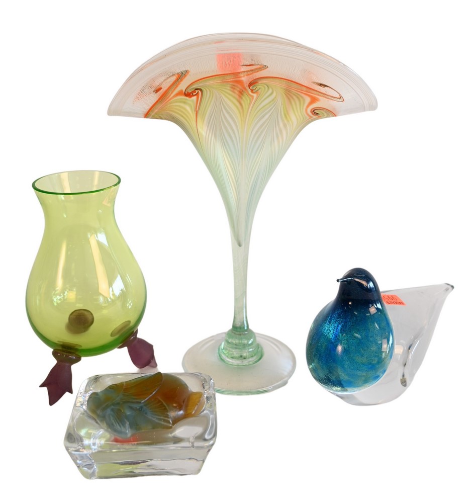 Four Piece Art Glass Group, to include Vandermark art glass fan vase “4358”, in green and orange, signed and dated “1977” to the und…
