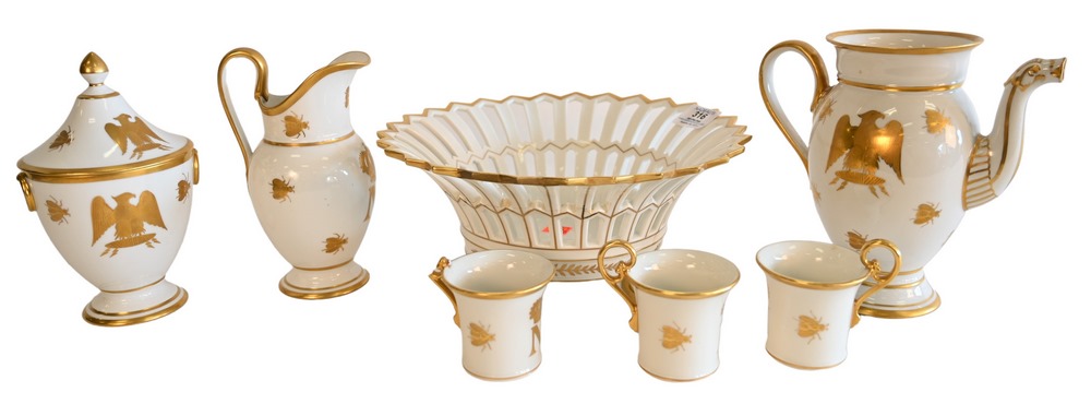 Group of French Gilt Napoleonic Porcelain, to include teapot, creamer, sugar, cups, along with center bowl, bowl height 4 1/2 inches…
