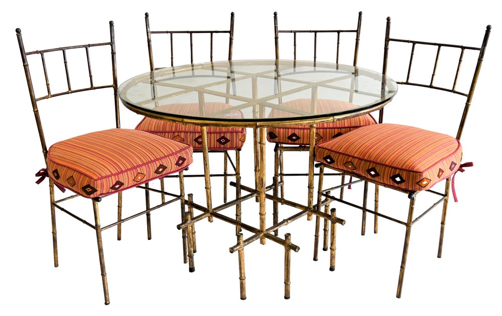 Five Piece Faux Bamboo Bistro/Patio Set, to include four side chairs with custom cushions along with a round glass top, table height…
