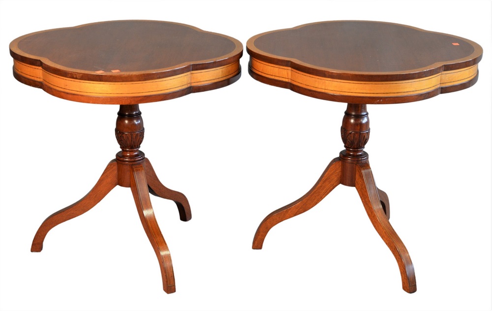 Pair of Mahogany Banded Inlaid Side Tables, each having shaped tops over pedestal base, height 27 1/2 inches, diameter 28 inches.