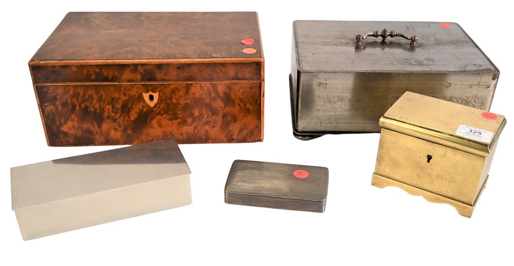 Five Piece Group of Boxes, to include a silver tobacco box, circa 1820 or later, an English steel box (missing key), circa 1800, a D…