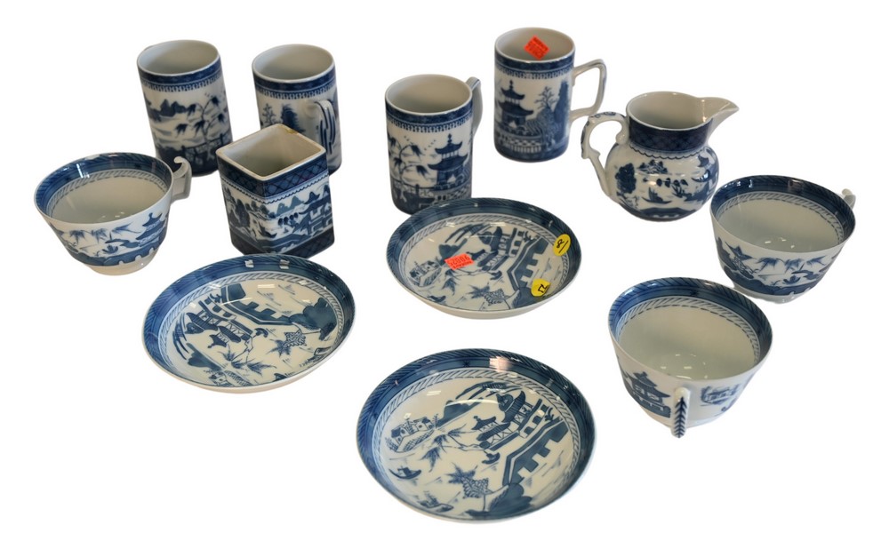 Twelve Piece Mottahedeh Blue Canton China, to include seven cups in two sizes, three saucer, and a creamer, tallest cup height 4 1/2…