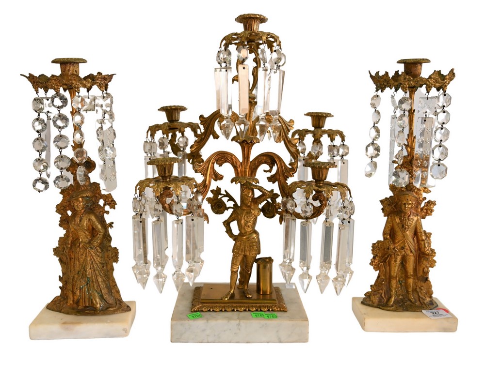 Three Piece Girandole Set, to include a pair of figural candlesticks and a four arm candelabra with a knight form, each mounted on m…